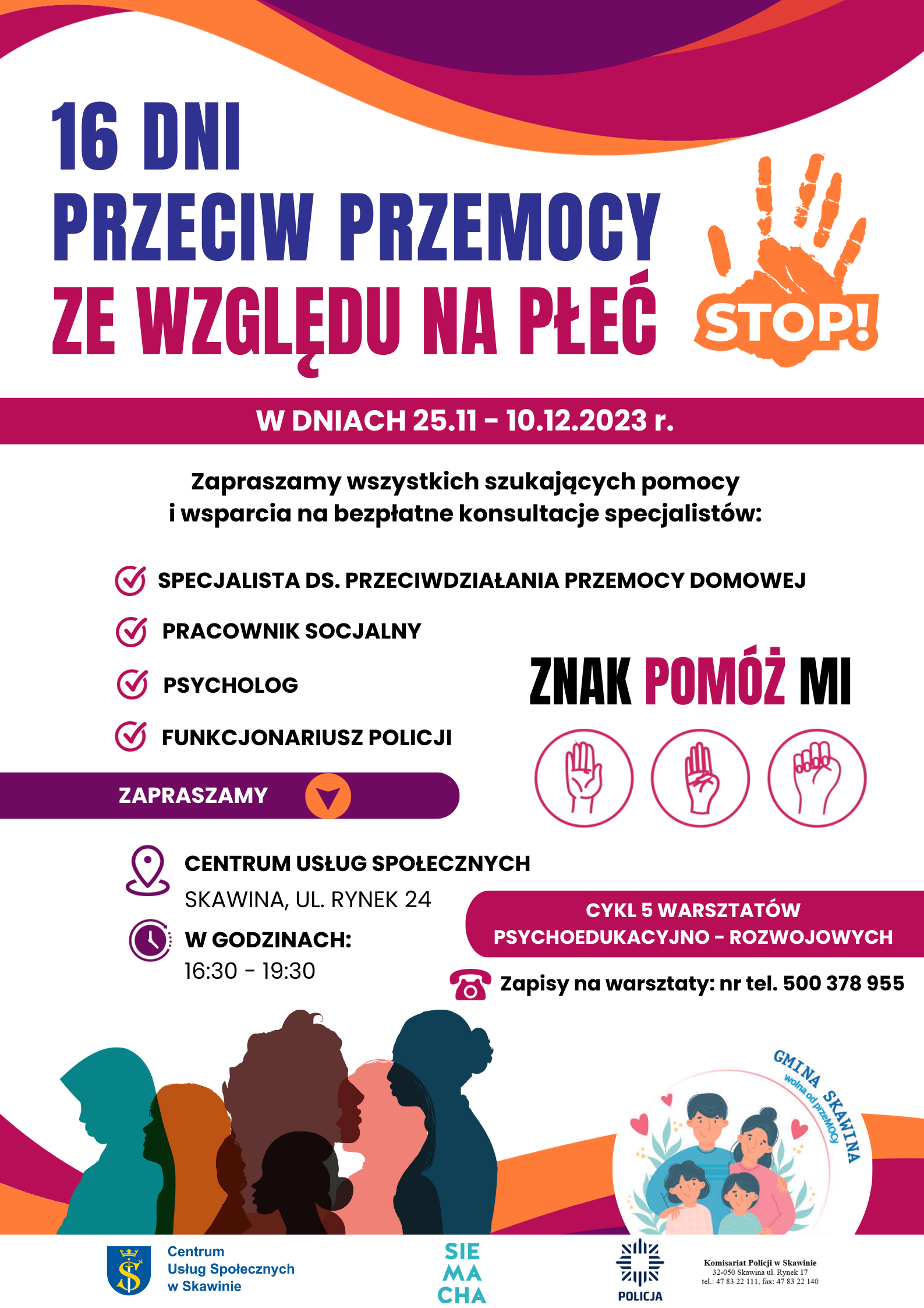 W przeciwdziałaniu przemocy niezbędne jest skoordynowane działanie wielu instytucji i specjalistów różnych dziedzin. Taka pomoc polega nie tylko na bezpośrednim wsparciu osób, które stają się jej ofiarami, ale obejmuje także działania profilaktyczne i prawne. Istotne jest także prowadzenie kampanii zwiększających świadomość i wrażliwość społeczną. Stąd po raz kolejny koordynowana przez Centrum Usług Społecznych w Skawinie i Zespół Interdyscyplinarny ds. Przeciwdziałania Przemocy Domowej w Skawinie kampania odbywa się z udziałem Policji i Stowarzyszenia „Siemacha”. Wspólnie możemy udzielać szerszego i profesjonalnego wsparcia dla osób zagrożonych przemocą oraz jej doświadczających.