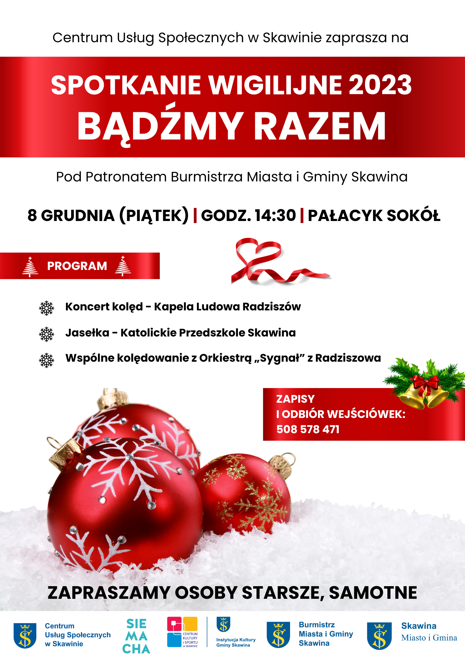 Centrum Usług Społecznych w Skawinie pod patronatem Burmistrza Miasta i Gminy Skawina zaprasza osoby starsze, samotne na spotkanie przy wigilijnym stole wśród życzliwych ludzi i przy dźwiękach kolęd.