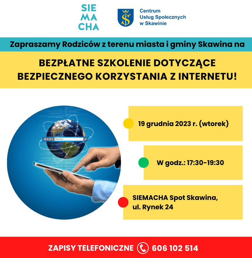 Razem z SIEMACHA Spot Skawina serdecznie zapraszamy rodziców na bezpłatne szkolenie dotyczące bezpiecznego korzystania z Internetu!