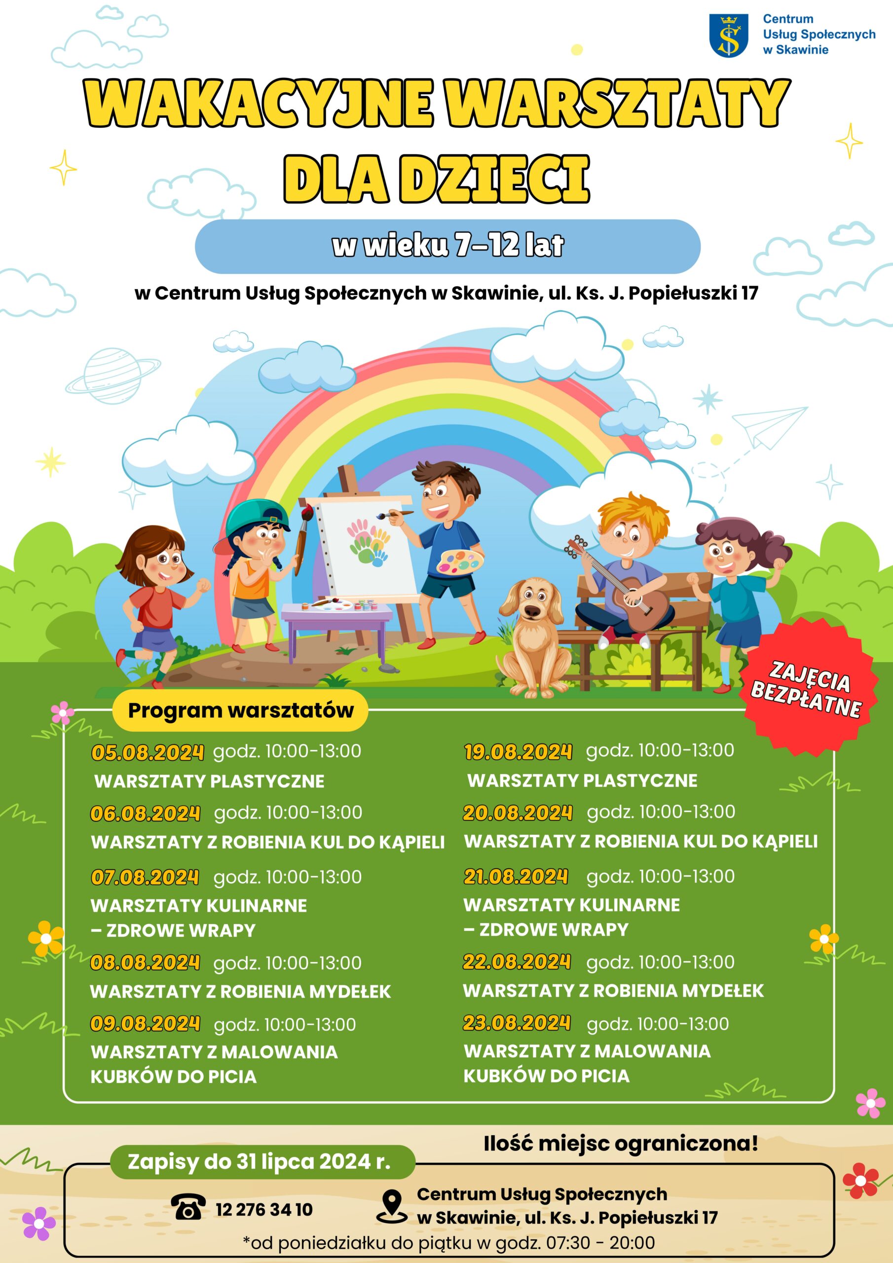 Centrum Usług Społecznych w Skawinie zaprasza DZIECI w wieku od 7- 12 lat na BEZPŁATNE zajęcia warsztatowe w okresie wakacyjnym.