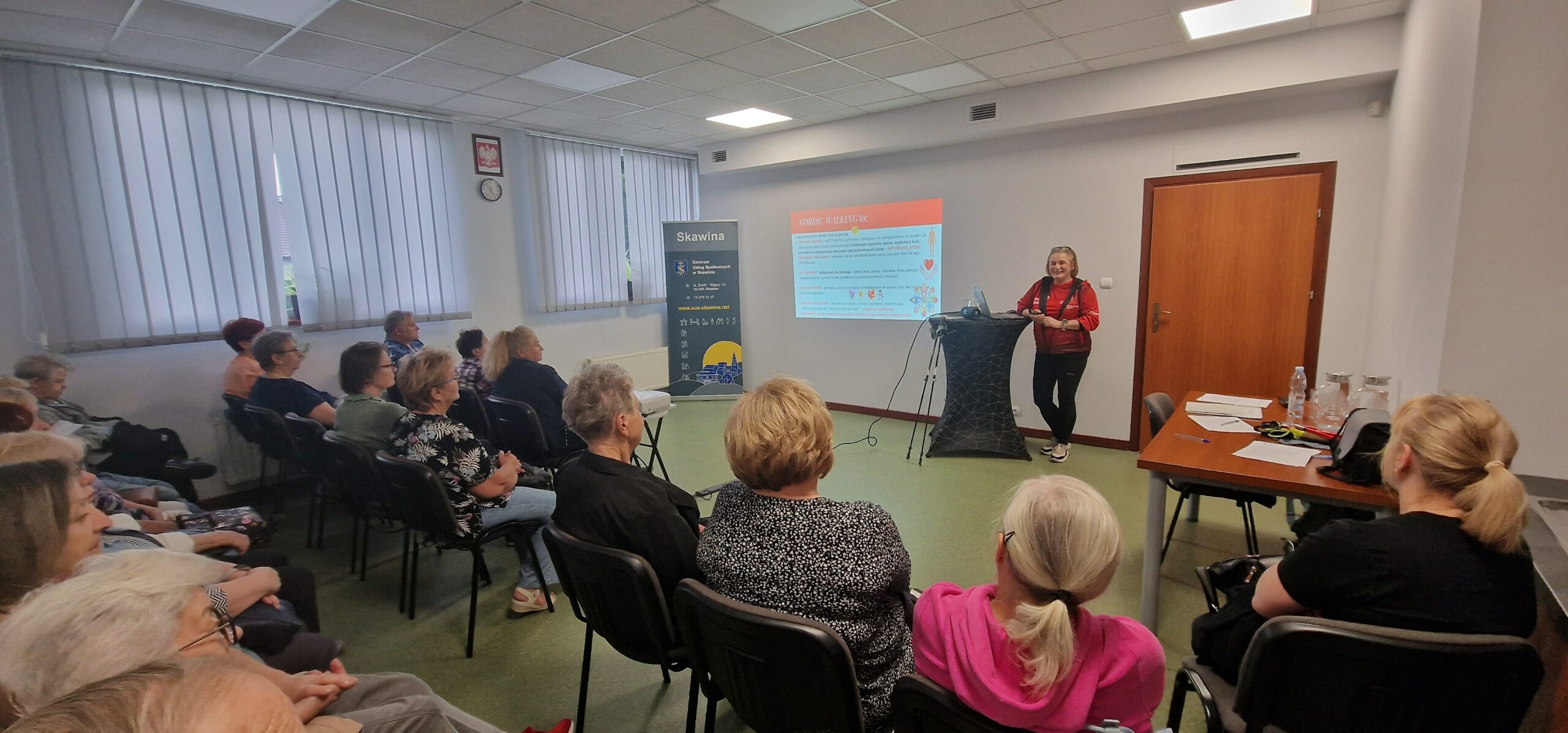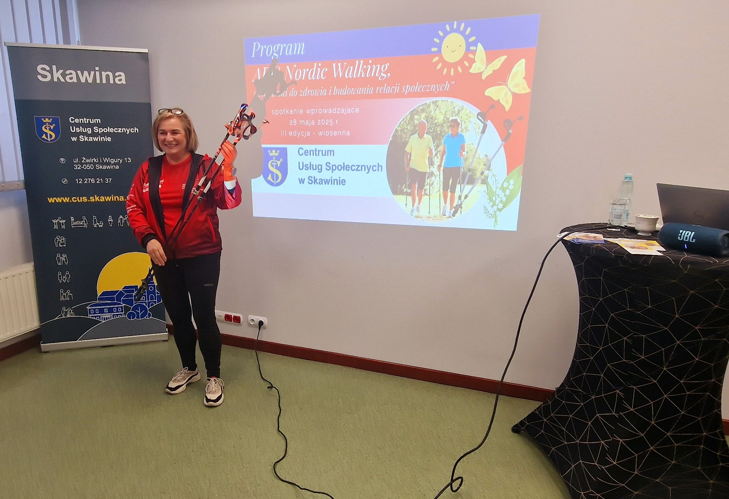 Program rozpoczął się w siedzibie Centrum Usług Społecznych przy ul. Ks. J. Popiełuszki 17, gdzie instruktorka Małgorzata Kopeć (posiadająca m. innymi licencję Polskiego Związku Lekkiej Atletyki, PSNW) wprowadziła uczestników w podstawy Nordic Walking. Omawiała technikę chodu, zasady właściwego poruszania się z kijkami i istotne aspekty związane z doborem odpowiedniego sprzętu. Instruktorka podkreślała, jak ważne jest prawidłowe stawianie kroków, odpowiednia praca ramion i rąk, a także poprawna postawa ciała, aby ćwiczenia były skuteczne i bezpieczne. Zwracała także uwagę na częste błędy, których unikanie pozwala seniorom w pełni czerpać korzyści z tej aktywności. Nie zabrakło również przybliżenia historii tej aktywności, która cieszy się coraz większą popularnością w Skawinie i na świecie.