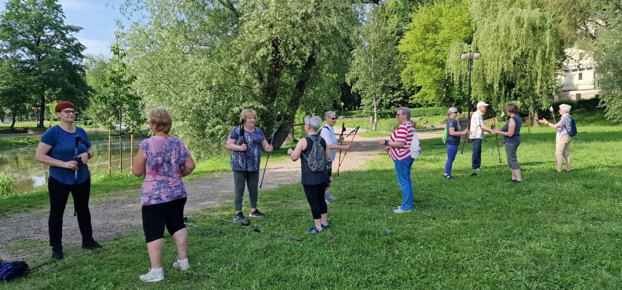 Kolejne warsztaty treningowo-instruktażowe odbywały się w Parku Miejskim w Skawinie, który zapewniał naturalne i sprzyjające zdrowiu otoczenie. Każde spotkanie miało jasno określoną strukturę, zaczynającą się od rozgrzewki, a następnie przechodzono do ćwiczeń siłowych i technicznych. Pod okiem instruktorki uczestnicy poznawali i doskonalili technikę prawidłowego chodu, ćwicząc każdy element „krok po kroku” takie jak: wymachy rąk z przodu i z tyłu, otwieranie i zamykanie dłoni, synchronizację ruchów, punkt wbicia kija, długi krok oraz aktywne zaangażowanie obręczy barkowej. Nie zabrakło również zabaw integracyjnych, które dodatkowo sprzyjały budowaniu więzi w grupie. Elementem każdego spotkania był również krótki spacer, podczas którego uczestnicy mogli praktycznie zastosować poznane na zajęciach elementy techniki. Każde zajęcia kończyły się ćwiczeniami oddechowymi i rozciągającymi, które miały na celu relaksację mięśni i zapobieganie nadmiernemu napięciu po treningu.