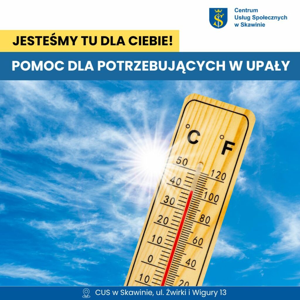 W trosce o bezpieczeństwo mieszkańców Centrum Usług Społecznych w Skawinie zachęca do wzajemnej troski i pomocy. Osoby potrzebujące wsparcia, a także wszyscy, którzy zauważą u sąsiadów lub bliskich potrzebę pomocy, mogą zgłaszać się do nas. Oferujemy pomoc m.in. w zrobieniu zakupów, dostarczeniu wody lub innym wsparciu w upalne dni.