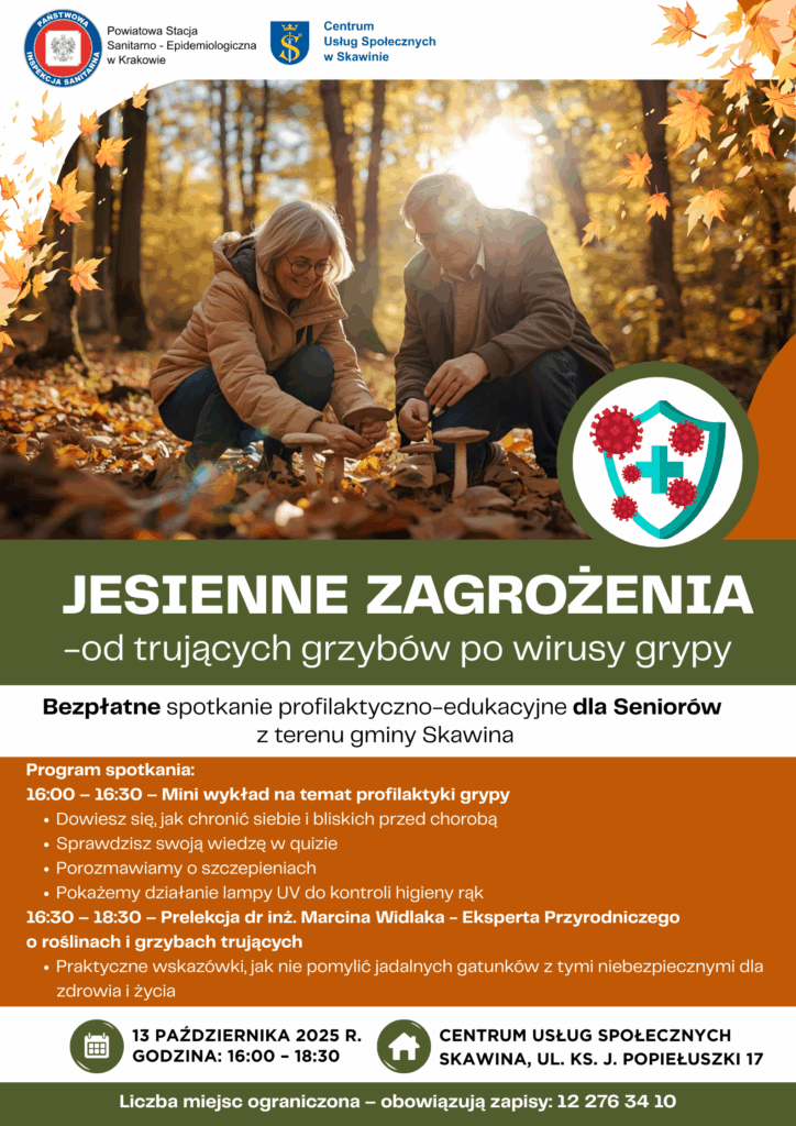 Centrum Usług Społecznych w Skawinie oraz Powiatowa Stacja Sanitarno-Epidemiologiczna w Krakowie zapraszają Seniorów z terenu gminy Skawina na spotkanie profilaktyczno-edukacyjne poświęcone jesiennym zagrożeniom zdrowotnym.