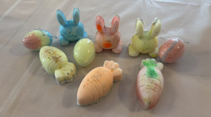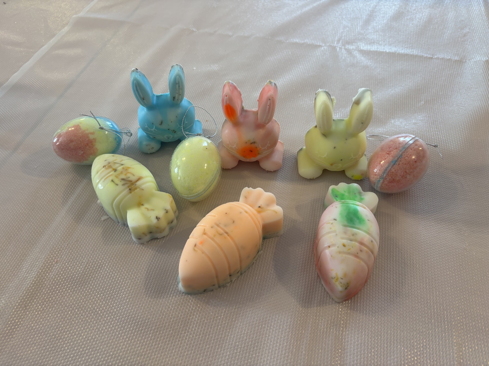 – ręcznie robione kule do kąpieli w kształcie pisanek oraz mydełka w formie marchewek i zajączków.