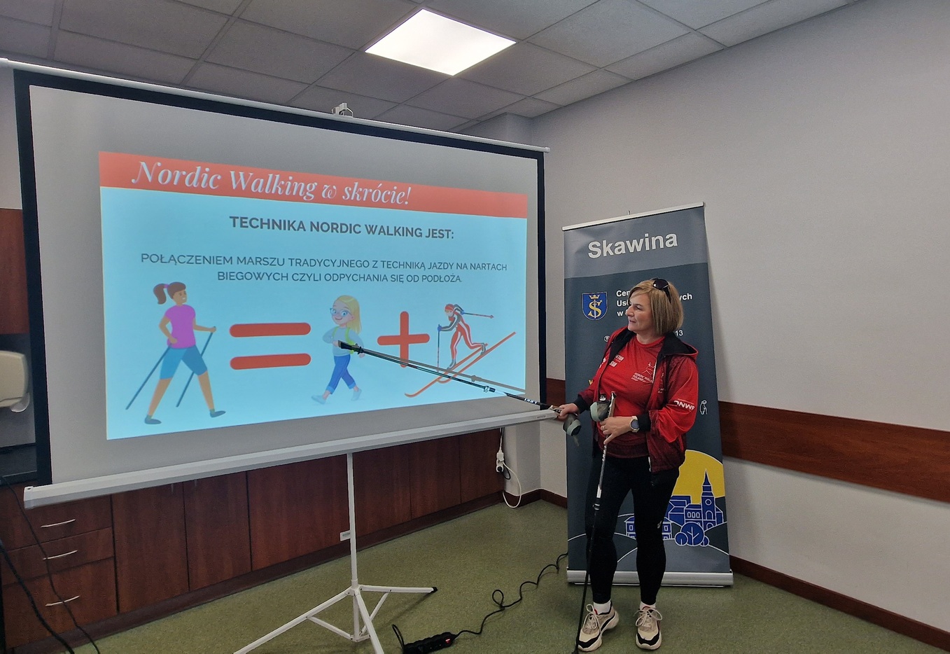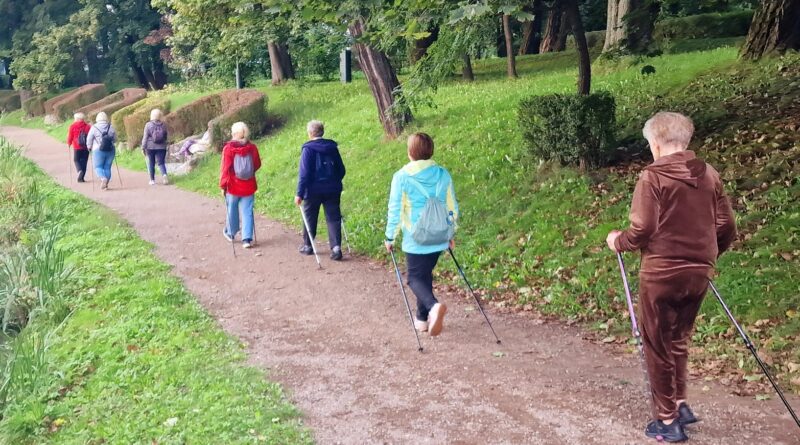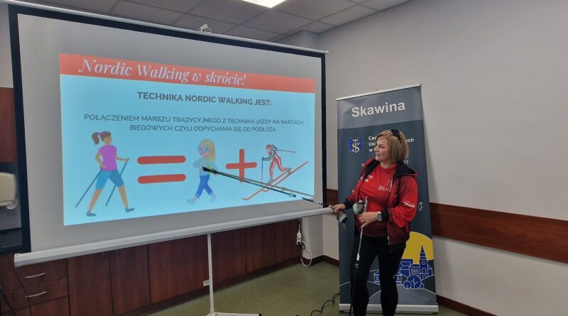 Omówiła technikę chodu, zasady prawidłowego poruszania się z kijkami oraz aspekty związane z doborem odpowiedniego sprzętu. Podkreślała znaczenie prawidłowego stawiania kroków, właściwej pracy rąk i ramion oraz utrzymania dobrej postawy ciała. Dzięki temu seniorzy mogli ćwiczyć w sposób bezpieczny i efektywny. Instruktorka zwróciła też uwagę na najczęstsze błędy oraz przybliżyła historię Nordic Walking – dyscypliny, która zdobywa coraz większą popularność w Skawinie i na świecie.