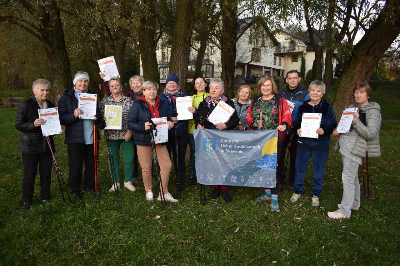 Na zakończenie programu każdy uczestnik otrzymał pamiątkowy certyfikat, materiały podsumowujące program – w tym charakterystykę prawidłowej techniki Nordic Walking – oraz informacje o dostępnych dla seniorów aktywnościach oferowanych przez Centrum Usług Społecznych i inne lokalne instytucje, czy NGO w listopadzie, który w gminie został ogłoszony „Miesiącem Seniorów’. Nasza Instruktorka zachęcała również do korzystania z „Kalendarium Usług Społecznych” i „Kalendarium Aktywności Gminnych”, aby seniorzy mogli dalej uczestniczyć w różnorodnych inicjatywach i wydarzeniach.