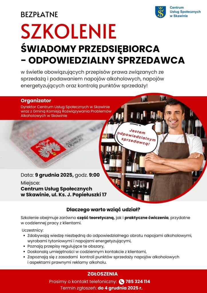 Dyrektor Centrum Usług Społecznych w Skawinie wraz z Gminną Komisją Rozwiązywania Problemów Alkoholowych w Skawinie zapraszają przedsiębiorców, sprzedawców, barmanów, kelnerów oraz wszystkie osoby podające napoje alkoholowe na bezpłatne szkolenie pt.: