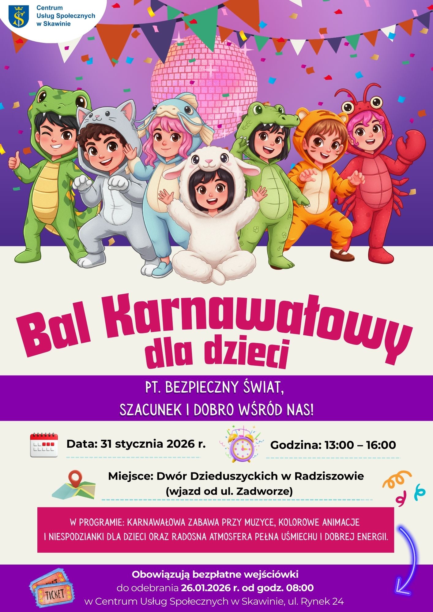 Centrum Usług Społecznych w Skawinie serdecznie zaprasza dzieci na Bal Karnawałowy, który odbędzie się pod hasłem: „Bezpieczny świat, szacunek i dobro wśród nas”.