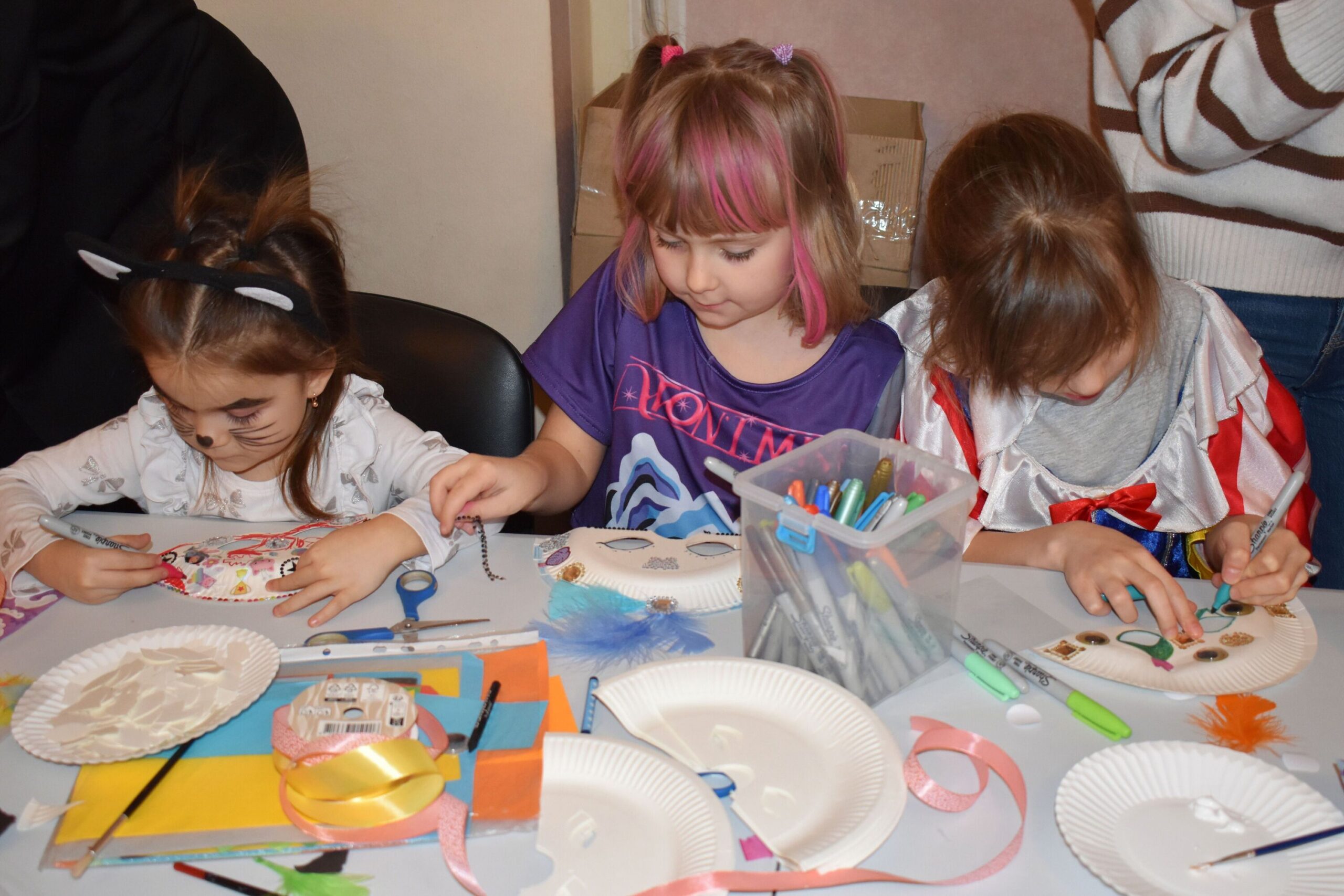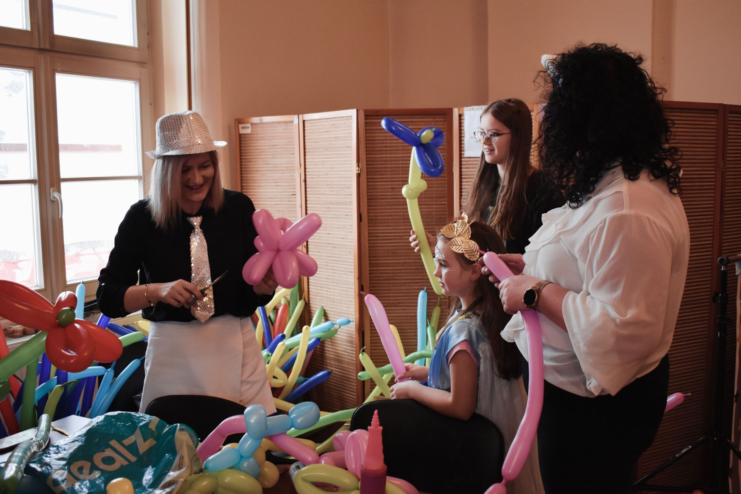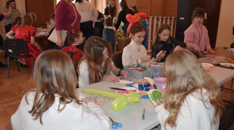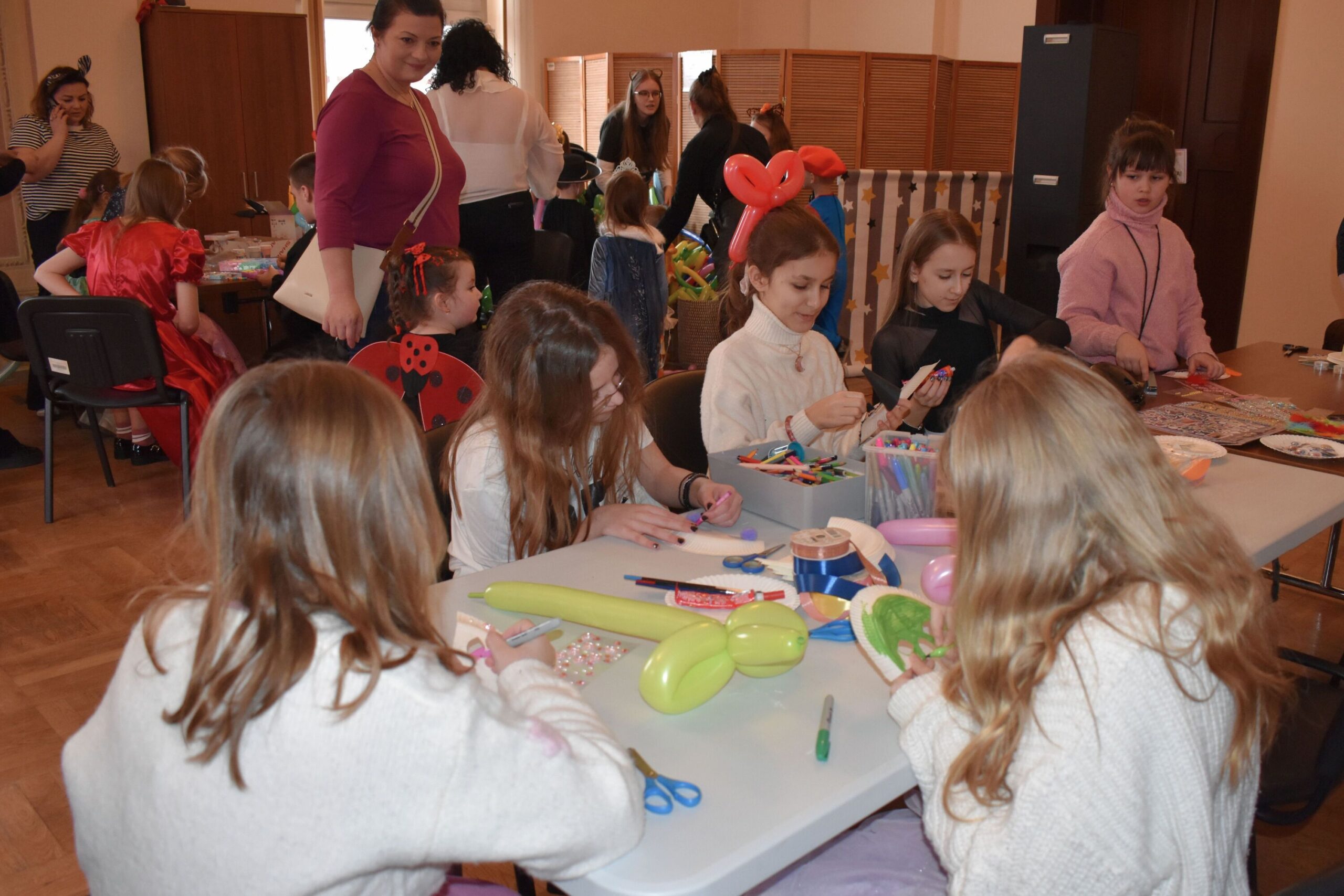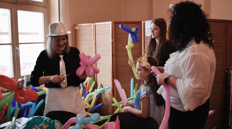 Wśród atrakcji kreatywnych dzieci mogły realizować różnorodne pomysły manualne – samodzielnie tworzyły bransoletki wolontariusze LO Skawina klasa I a, przy wsparciu wolontariuszy z Placówki Wsparcia Dziennego dla Dzieci i Młodzieży Stowarzyszenia SIEMACHA ozdabiały własne maski karnawałowe, a także miały możliwość zabawy z kolorowymi balonami, które kręcili wspólnie z pracownikami CUS.