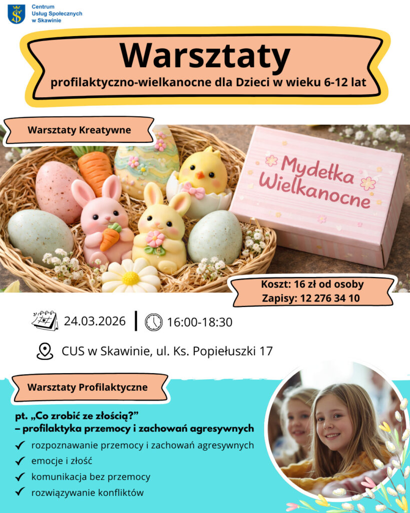 Zapraszamy dzieci w wieku 6–12 lat z Gminy Skawina do udziału w warsztatach profilaktyczno-wielkanocnych. Zajęcia łączą elementy edukacyjne dotyczące emocji i relacji z aktywnościami twórczymi. Celem spotkań jest wspieranie rozwoju kompetencji społecznych, nauka radzenia sobie z emocjami oraz bezpieczne i kreatywne spędzenie czasu.