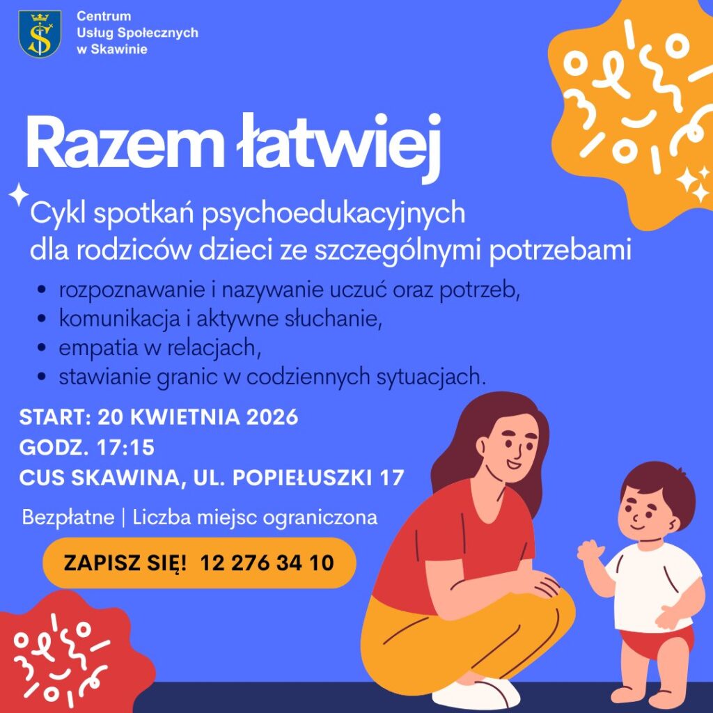 Centrum Usług Społecznych w Skawinie zaprasza rodziców dzieci ze szczególnymi potrzebami – m.in. z niepełnosprawnościami, w spektrum autyzmu czy z ADHD – do udziału w cyklu spotkań psychoedukacyjnych. To przestrzeń do zdobycia praktycznej wiedzy, wymiany doświadczeń oraz wzmocnienia swoich kompetencji rodzicielskich. Podczas spotkań poruszone zostaną m.in. zagadnienia dotyczące skutecznej komunikacji z dzieckiem oraz sposobów radzenia sobie z trudnymi emocjami – zarówno dziecka, jak i rodzica.