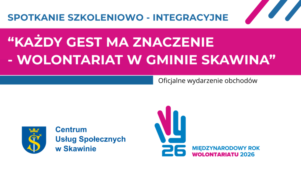 Serdecznie zapraszamy koordynatorów oraz opiekunów klubów wolontariatu na wyjątkowe spotkanie pt. „Każdy gest ma znaczenie – wolontariat w gminie Skawina”, które odbędzie się w dniu 14 kwietnia 2026 r. (wtorek) godz. 12:30 – 15:30 w Centrum Usług Społecznych w Skawinie, ul. Ks. J. Popiełuszki 17.