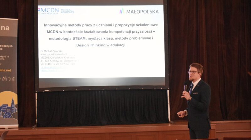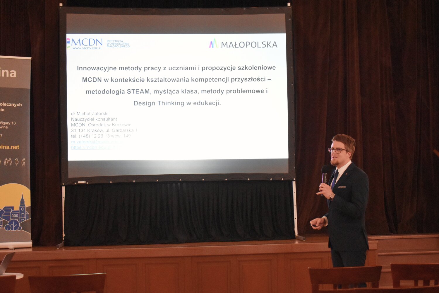 dr Michał Zatorski – omówił innowacyjne metody pracy z uczniami, w tym podejście STEAM, koncepcję „myślącej klasy”, metody problemowe oraz Design Thinking w edukacji.